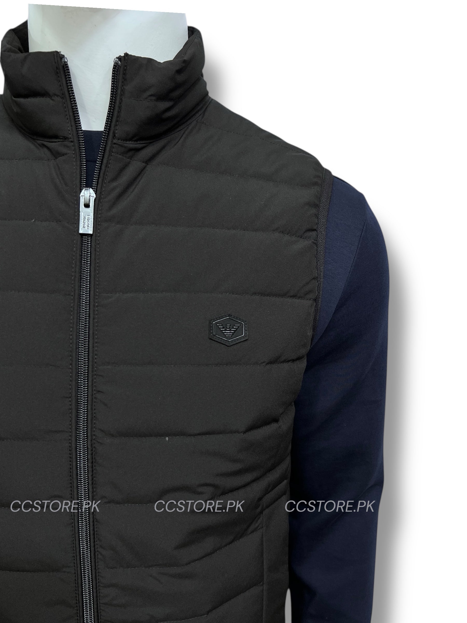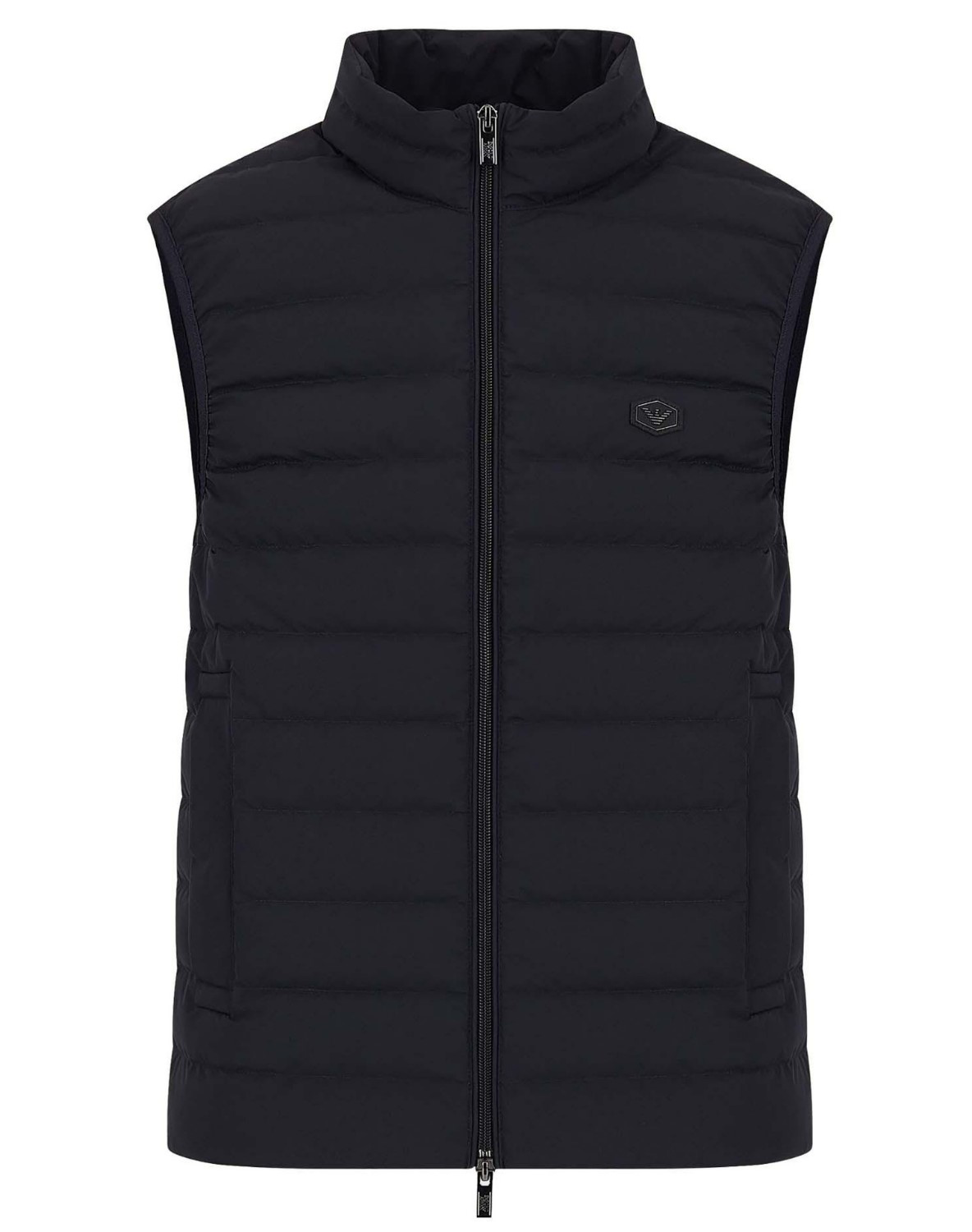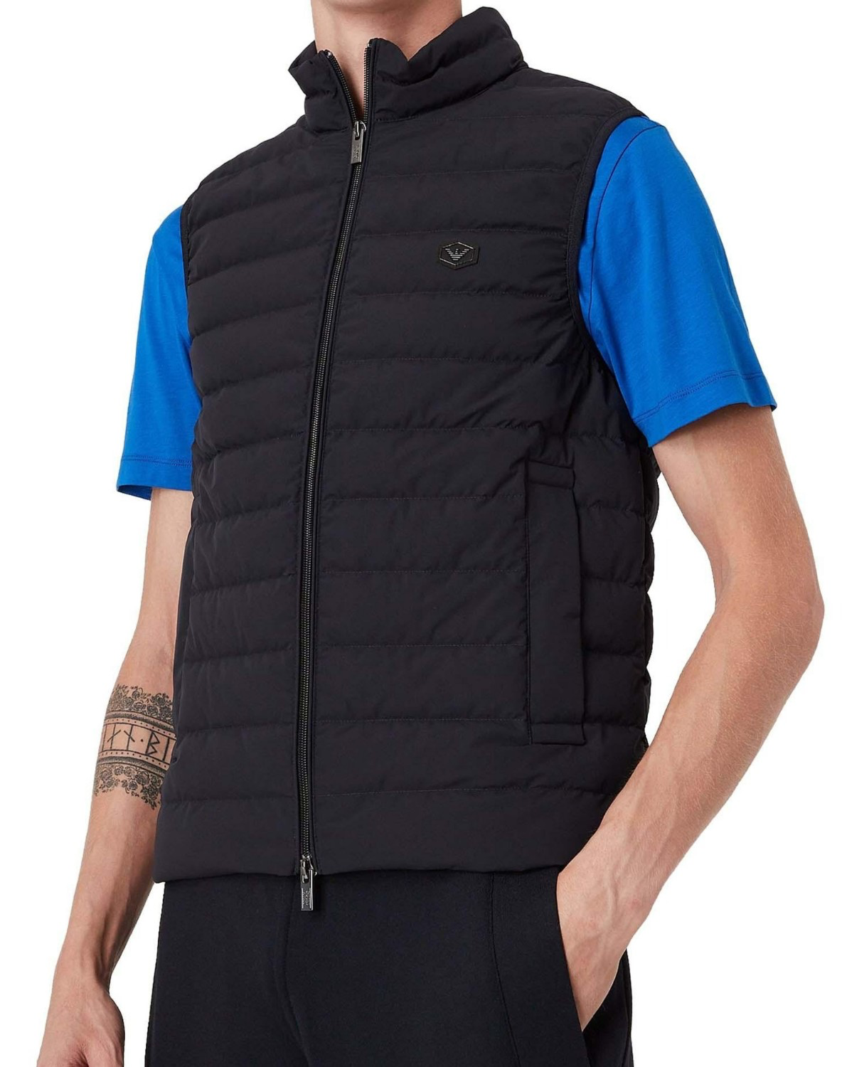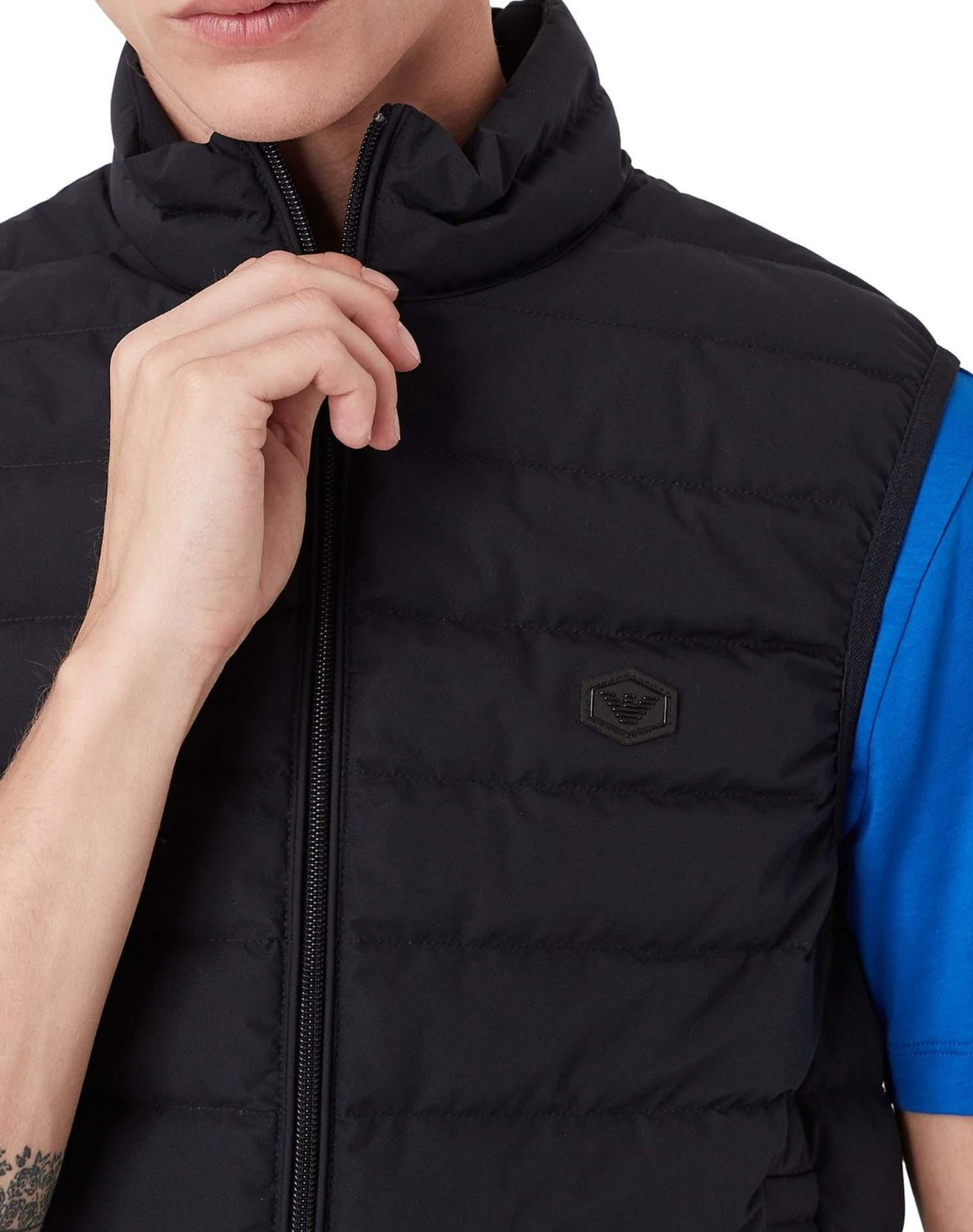 Sleeveless nylon down jacket with full-zip fastening and eagle patch on the chest. The simple, modern nature of this men’s down jacket is enhanced by genuine feather padding and a matelassé effect. The perfect item for urban day wear. This item belongs to the Essentials clothing selection, the Emporio Armani capsule collection that is an evergreen statement of style: an ongoing collection with clean, well-designed shapes for a wardrobe that meets the demands of any season. These “essential”, versatile pieces are a must-have for the male wardrobe.