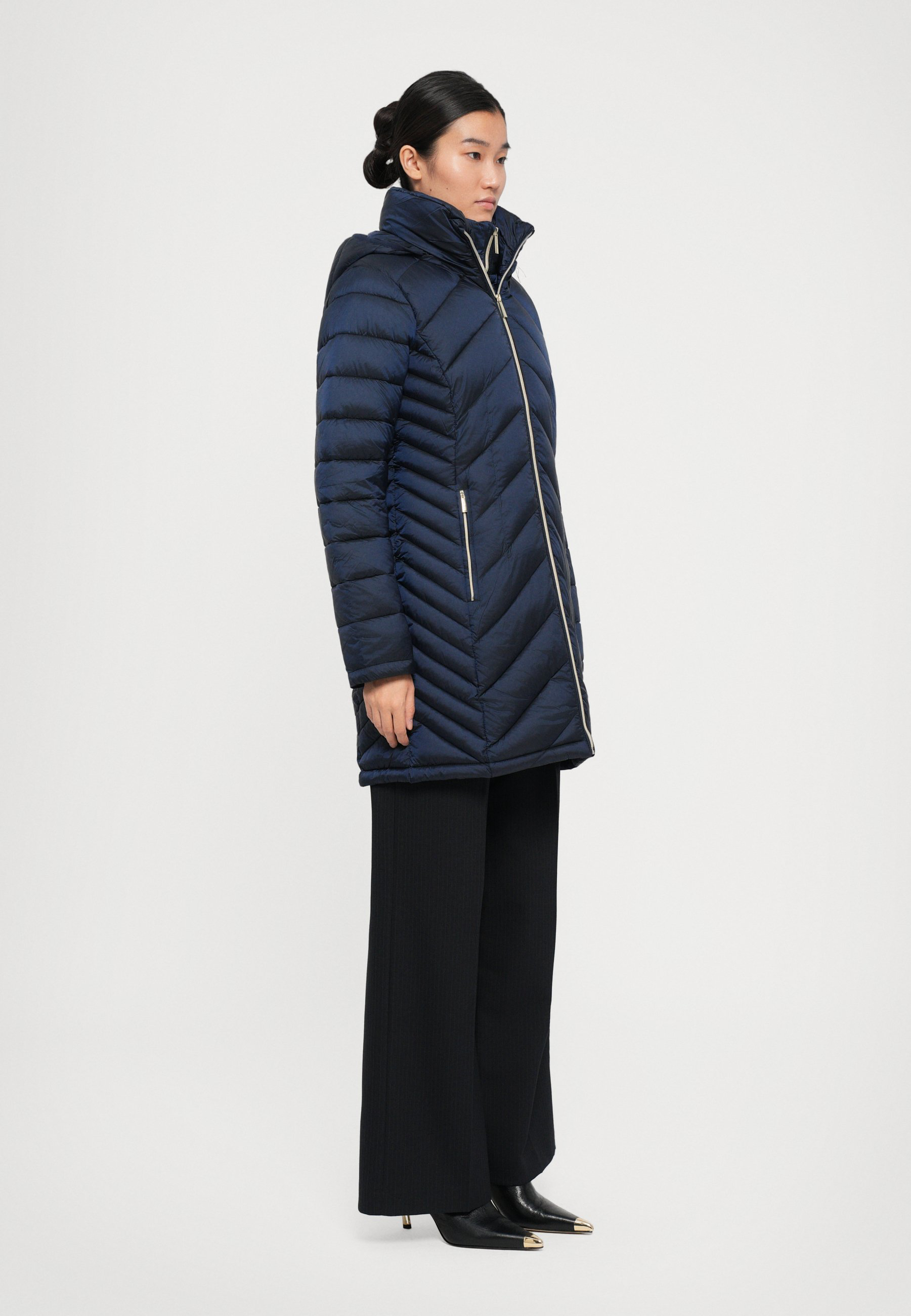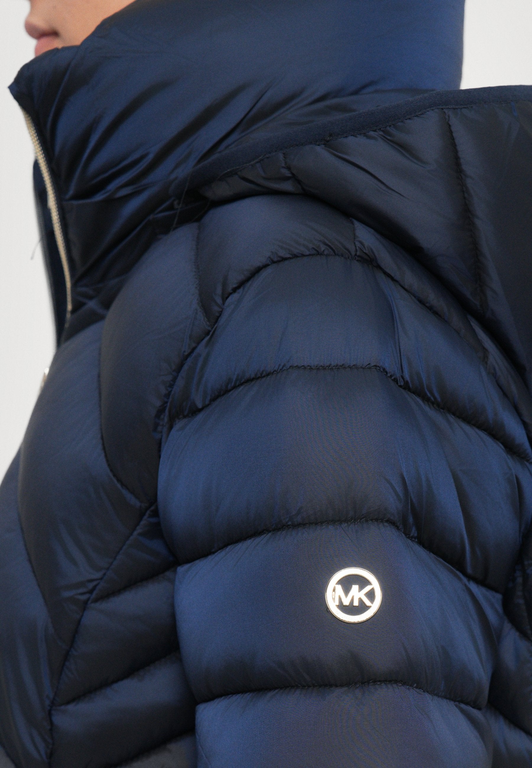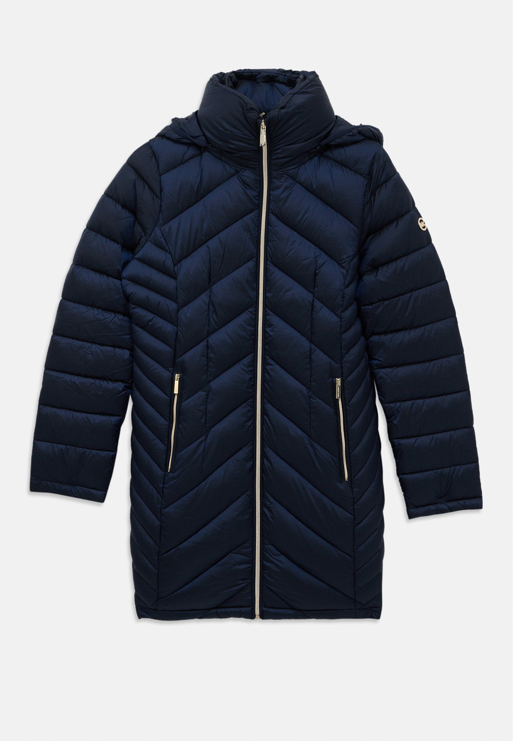 MK Women Long Line Removable Hood Navy Blue Puffer Jacket