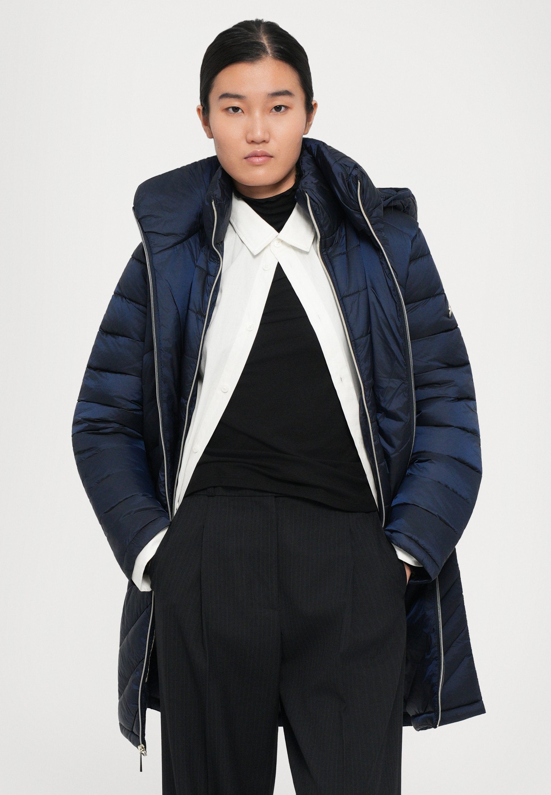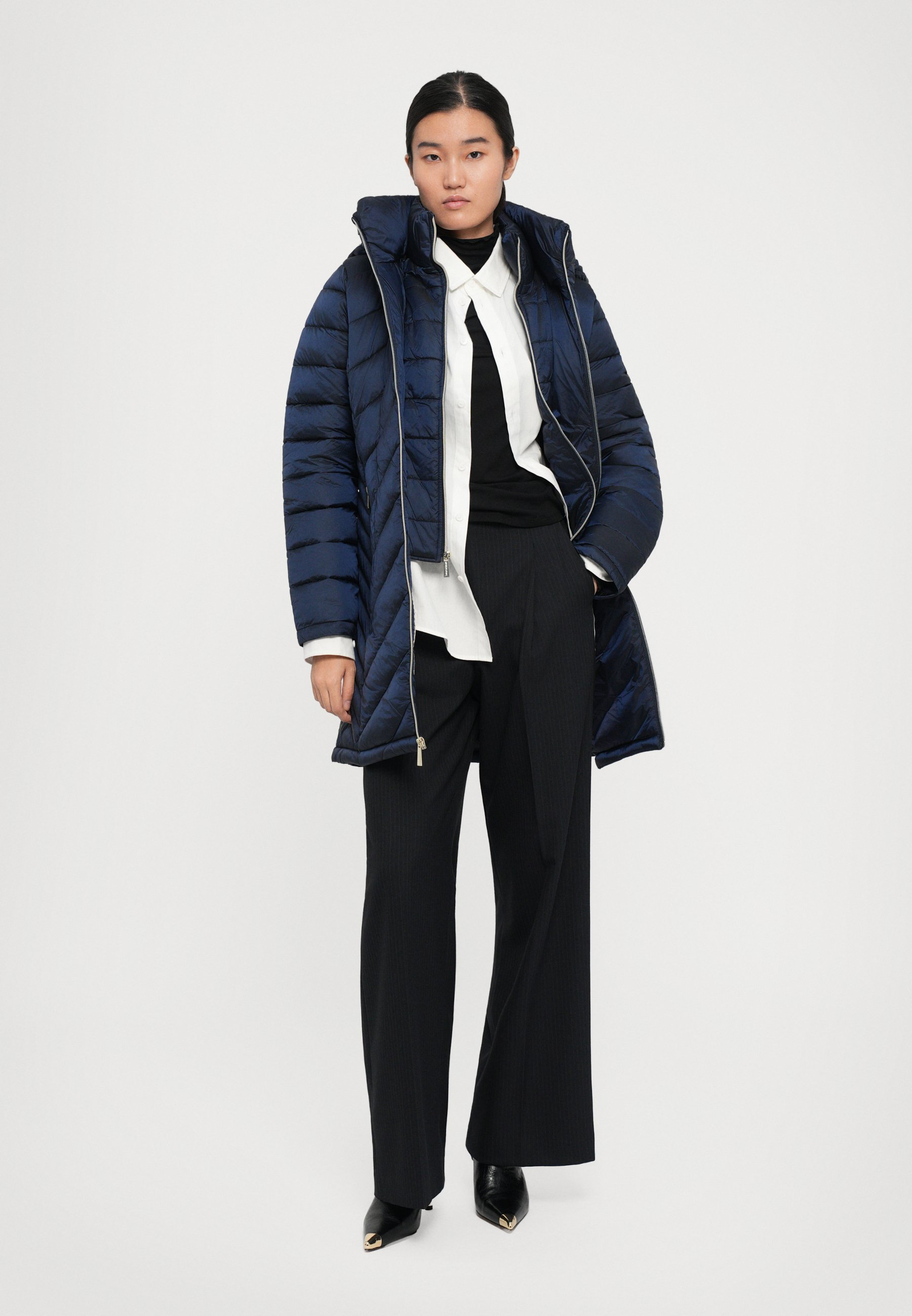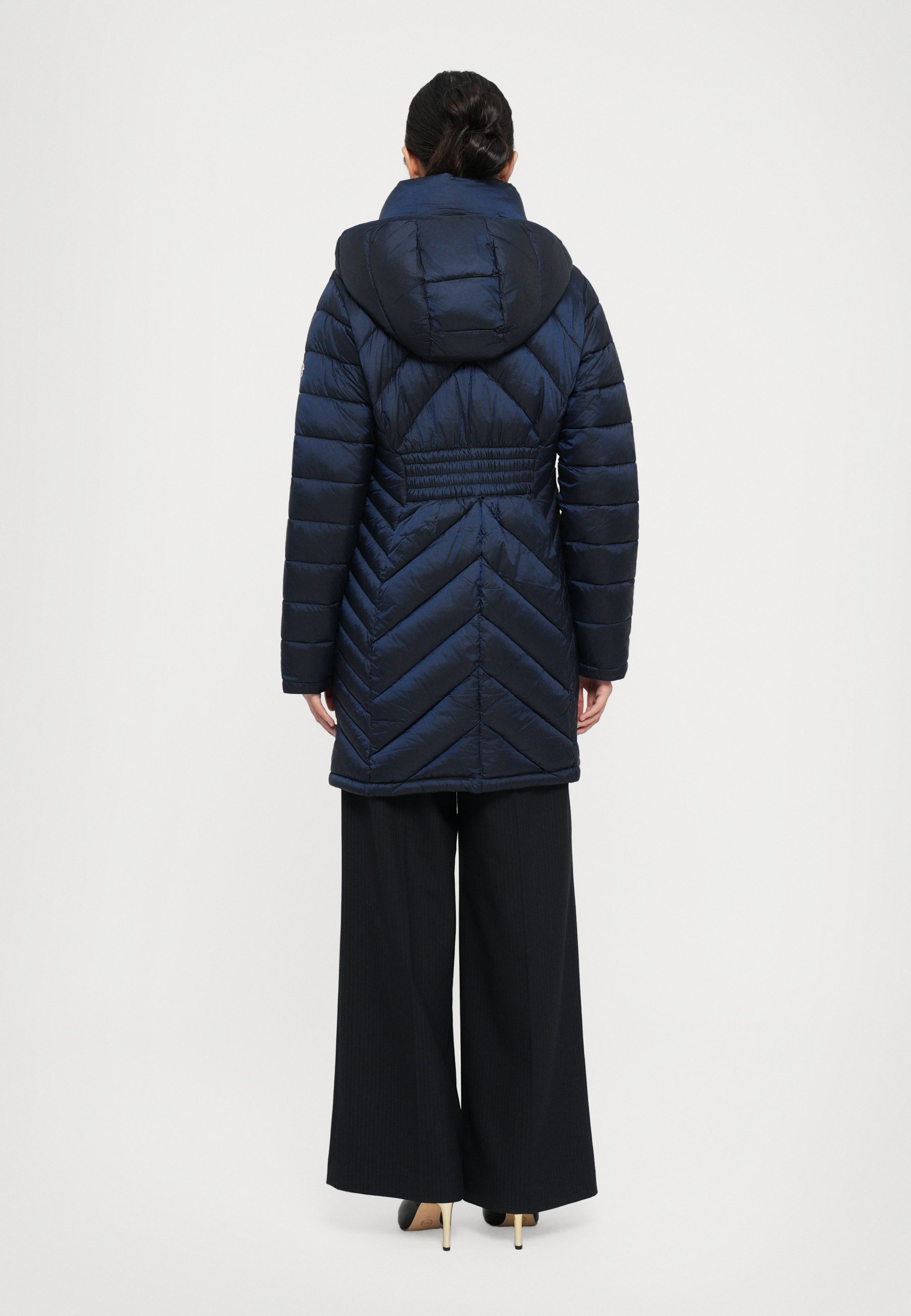 MK Women Long Line Removable Hood Navy Blue Puffer Jacket