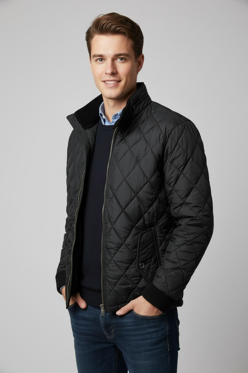 - Mockneck with a two-button closure on the front and corduroy facing. Full-zip front. Leather zip pull.