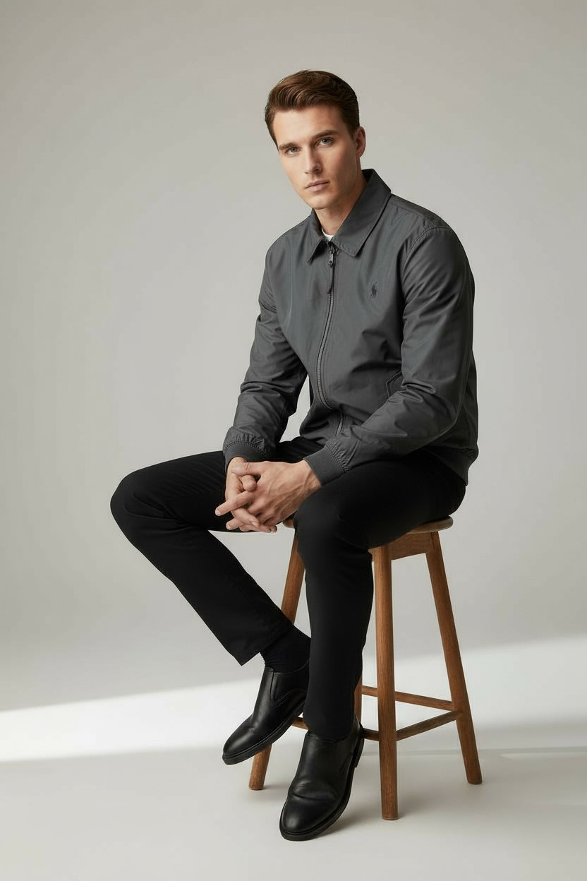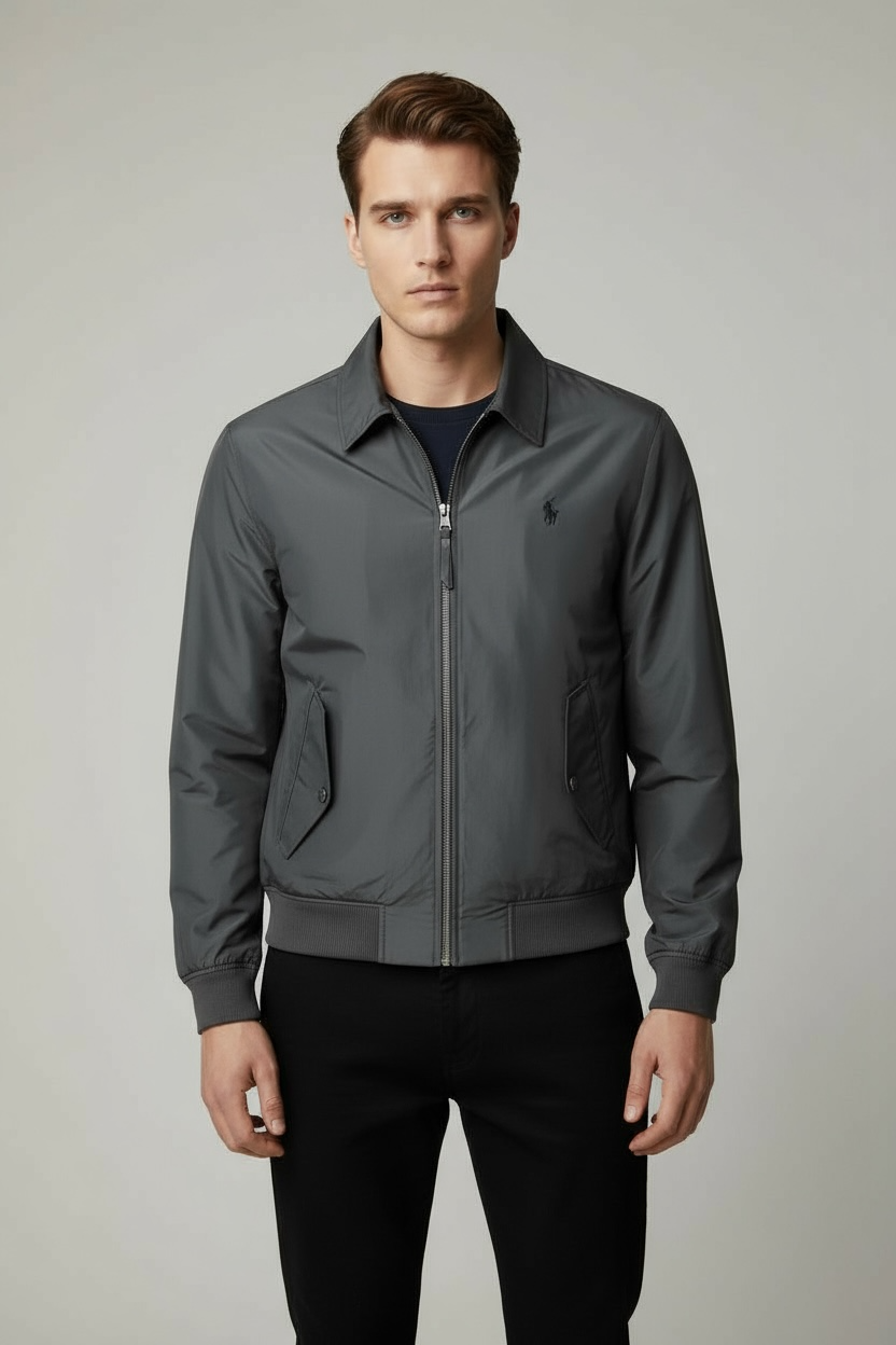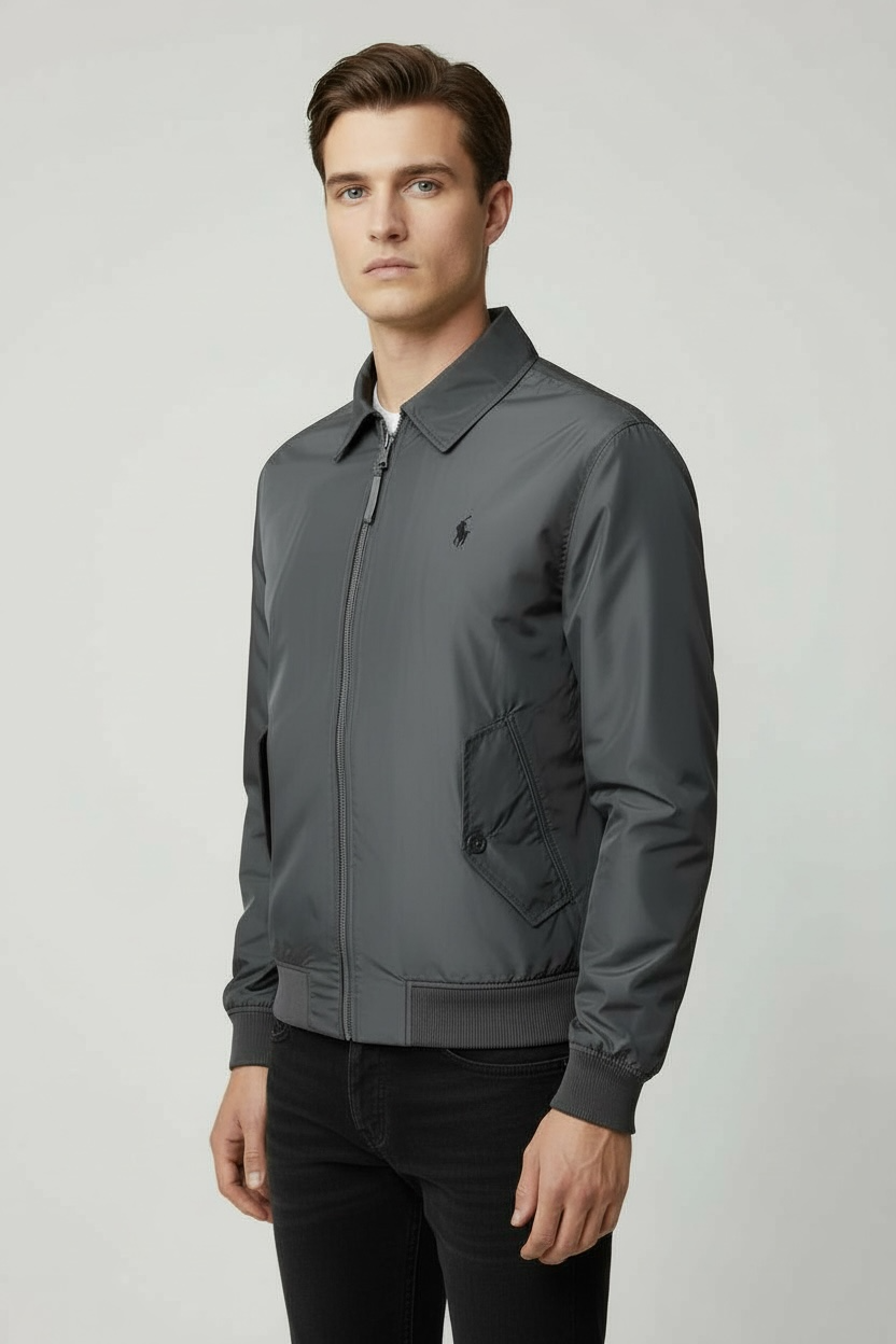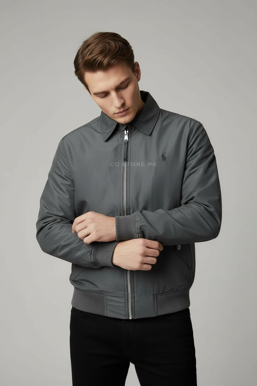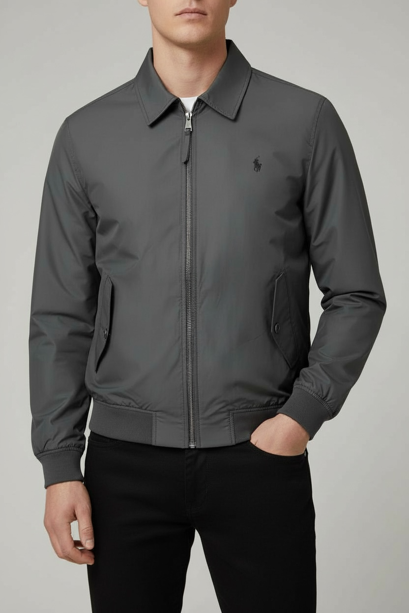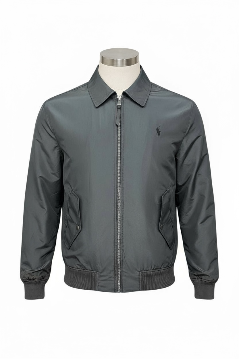 •    Point collar. Buttoned throat tab. Full-zip front with a leather zipper pull.